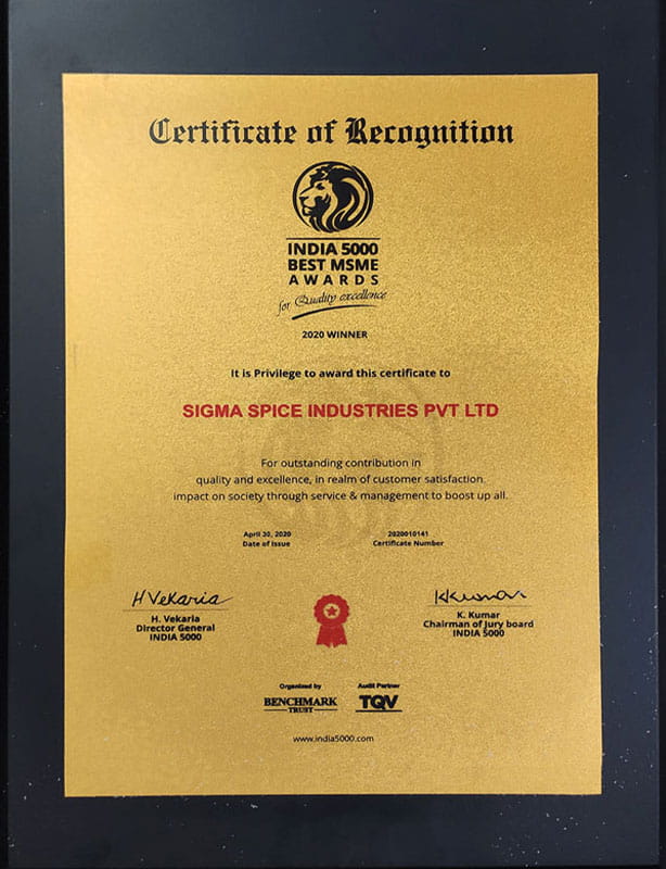 Guided by the belief “Think Great to Achieve Greater,” Sigma Spice Industry aims to become a trusted name in quality spices for every home. We strive to serve households across India and beyond with products made ethically, responsibly, and with unwavering commitment to excellence.