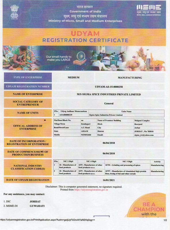 Produced by Sigma Spice Industries Pvt. Ltd., the brand has grown to become a trusted name across Northeast India, known for its commitment to purity, aroma, and quality.